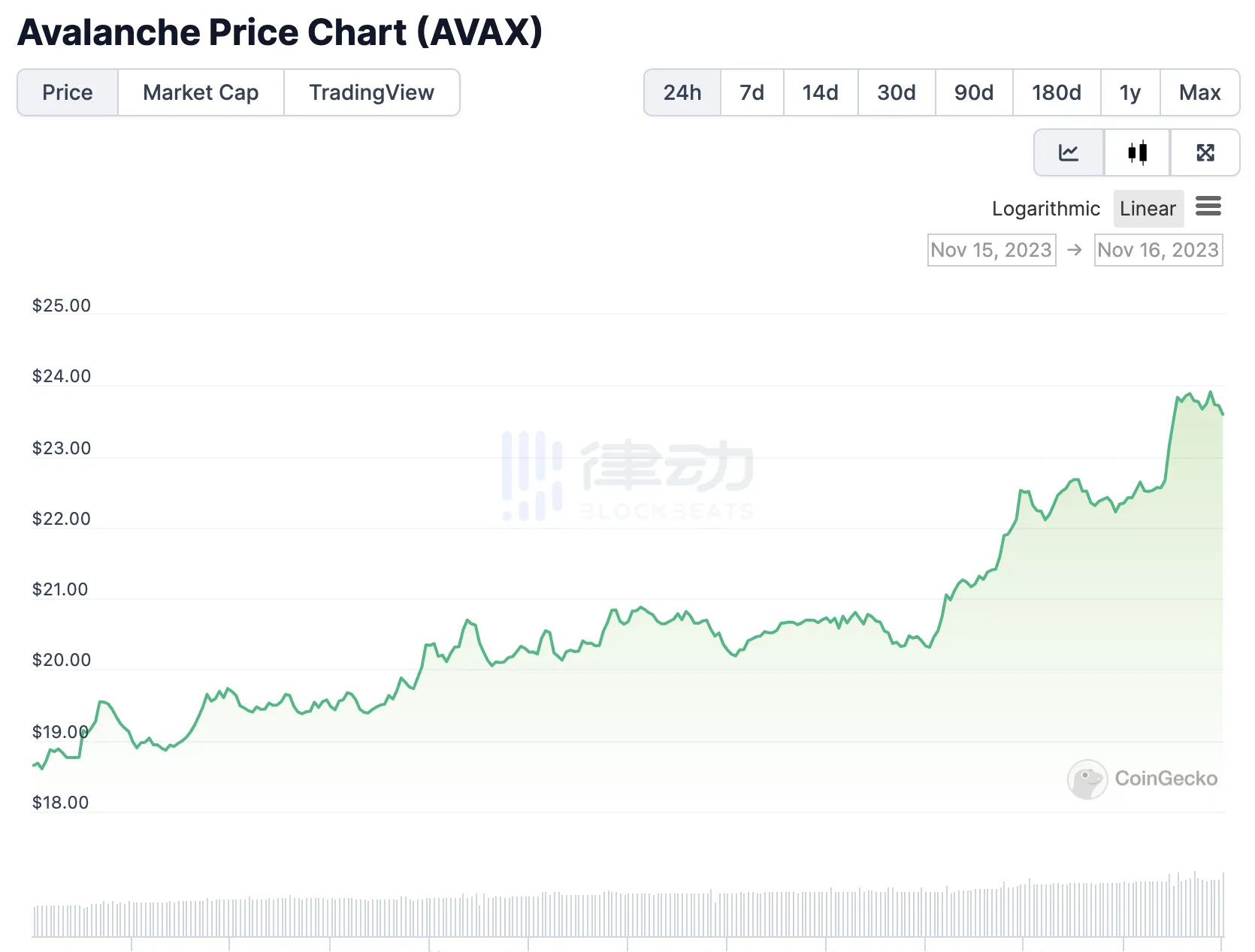 11 月 16 日,Avalanche 生态系统的原生代币 AVAX 短时拉升触及 24 美元,据 CoinGecko 数据显示,24 小时涨幅达 26.2%,7 日涨幅达 77.5%,30 日涨幅达 152.1%,截止发稿时报价为 23.65 美元。