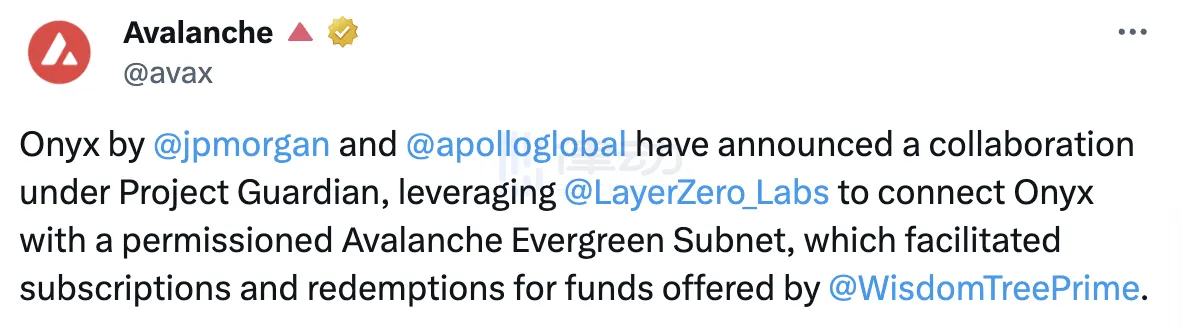 11 月 15 日,Avalanche 官方宣布,摩根大通数字资产平台 Onyx 与另类资产管理公司 Apollo 达成合作,「展示概念验证(PoC,proof-of-concept)」,这项合作也被囊括进新加坡金融管理局(MAS)与金融业合作推出的「守护者计划」(Project Guardian)中。