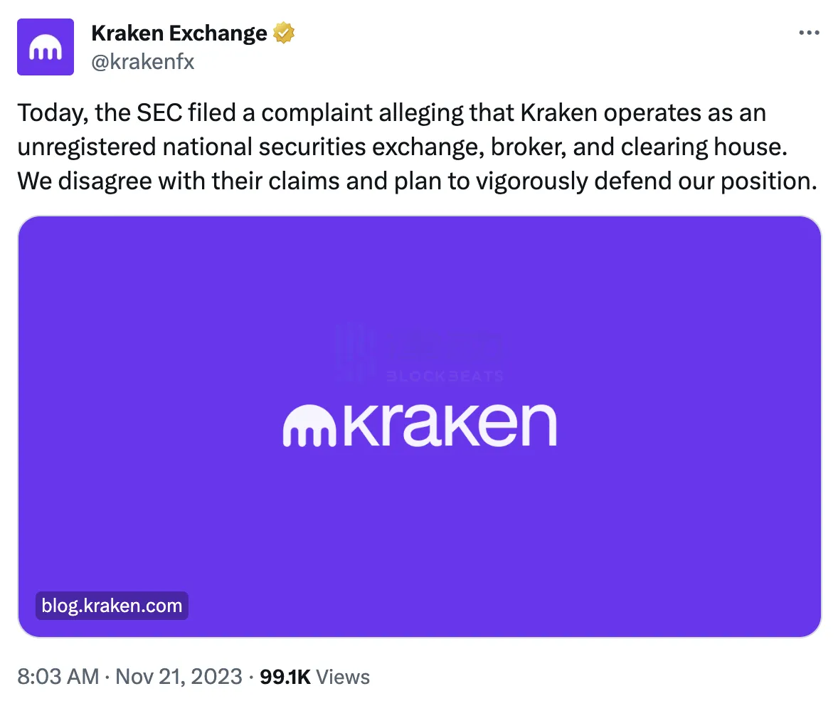 11 月 21 日,Kraken 官方在社交媒体上针对受 SEC 指控一事发文表示,Kraken 并不同意 SEC 的主张,并计划大力捍卫自己的立场:「被指控的新闻对 Kraken 提供的产品没有影响,我们将继续不间断地为客户提供服务。」