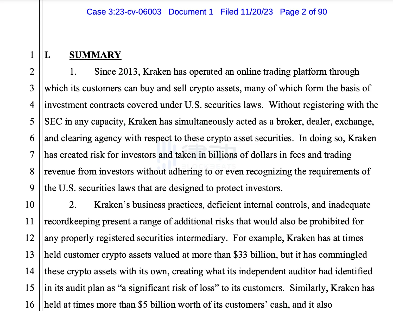 SEC 称 Kraken 违反了联邦证券法,并援引了 Kraken 独立审计的报告,称 Kraken 将高达 330 亿美元的客户加密货币与企业自有资产混合,造成了「重大风险」。