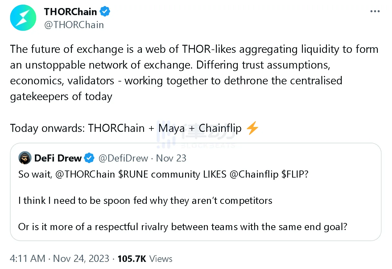 在接下来几周内,THORChain 希望能够达成与世界上任何钱包进行交易的目标,就连竞品项目也被 THORChain 视为友好合作伙伴。11 月 24 日 THORChain 发布的一则推文表示:THORChain + Maya + Chainflip,将共同挑战当今的中心化门户,而 THORChain 的桌面钱包 ASGARDEX 也于 12 月 8 日发布 1.20.8 更新版本,并宣布上线 MayaChainWallet 功能。