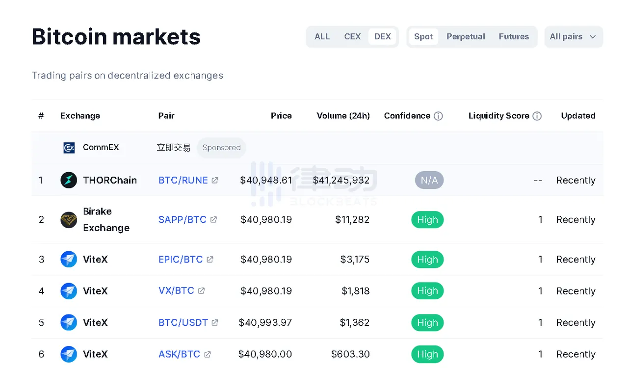 另据 bitcoin market 数据显示,THORChain 已经成为链上 BTC 交易的第一大阵地,24 小时交易超 4 千万美元,比排行第二的 Birake Exchange 高出 4000 倍。