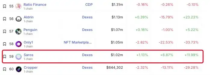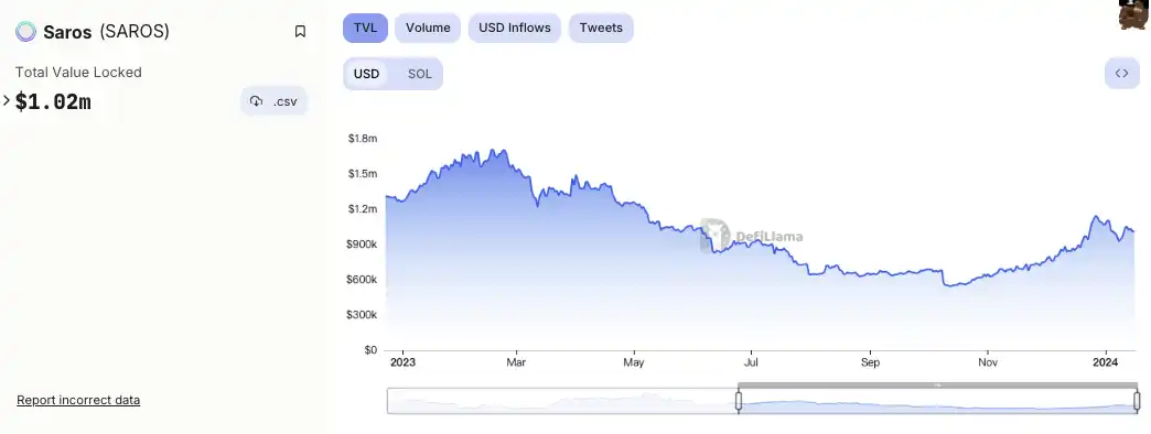 据 DeFiLlama 显示,虽然近 3 个月以来,Saros Finance 的 TVL 稳步上升,但在 Solana 生态中,Saros Finance 的表现还不算突出,其 TVL 仅为 100 万美元左右。