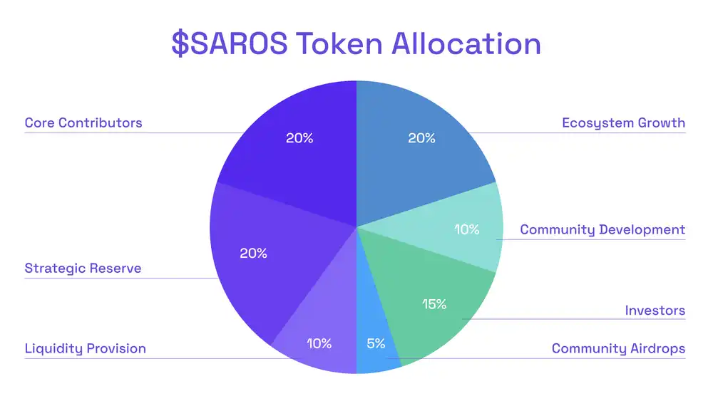 $SAROS 代币经济学已经公布,其中 5% 用于社区空投,此外,20% 分配至核心贡献者、20% 用于生态增长、20% 分配至战略储备、15% 分配至投资方、10% 用于流动性供应、10% 用于社区发展。空投细则暂未发布。