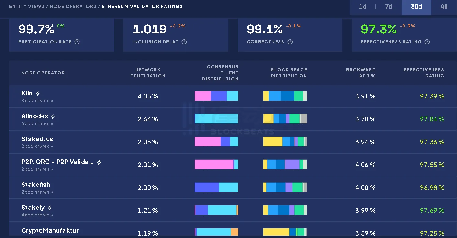 但近期,随着再质押叙事的兴起以及空投预期导致的 FOMO 情绪,LSDFi 也再次被津津乐道。乘着这波浪潮,Kiln 现在成为以太坊上排名第一的节点运营商。据以太坊质押看板rated.network,Kiln 基础设施管理着约 4% 的质押以太坊,相当于管理着约 40 亿美元的资产。