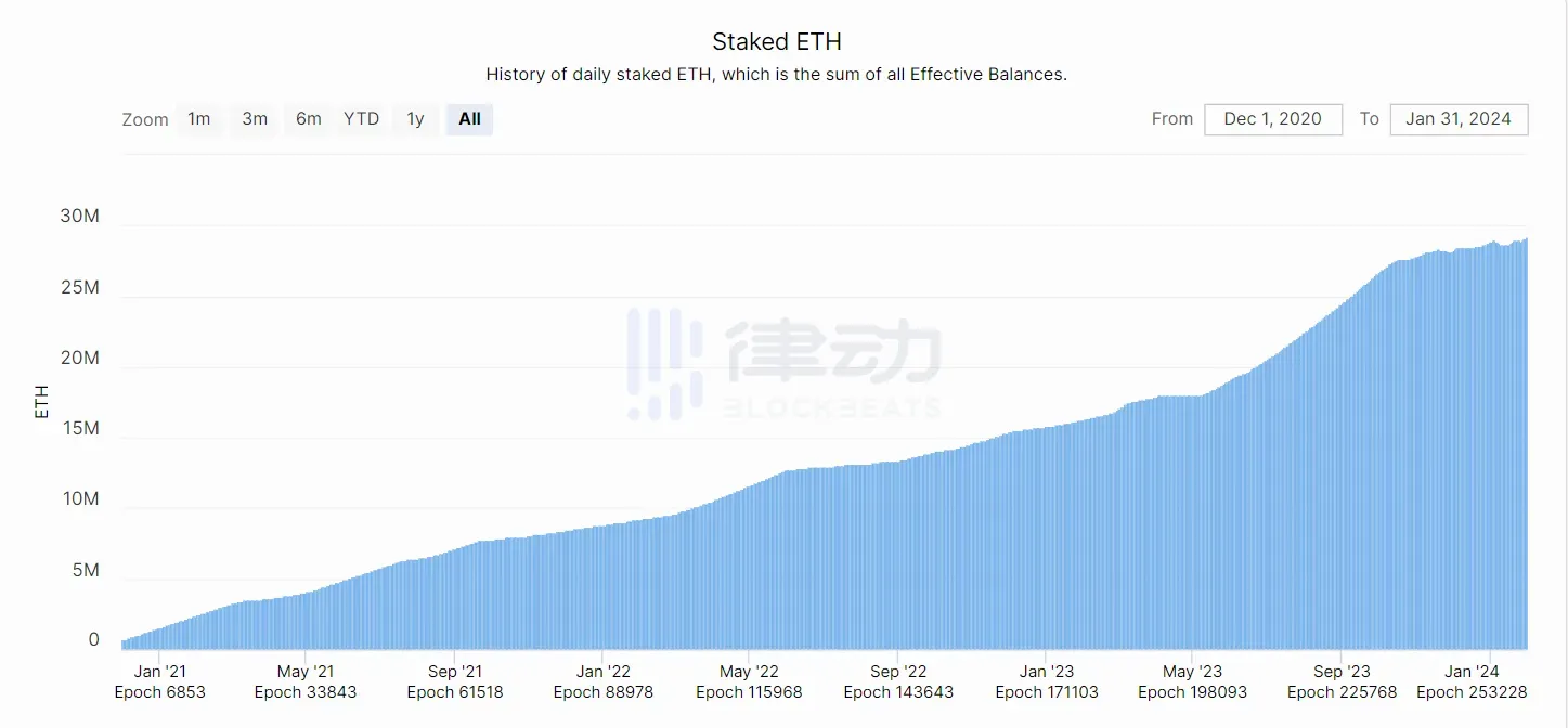 大约四分之一的流通中的 ETH 被质押了(总共 1.2 亿 ETH,约约 3000 万被质押)。