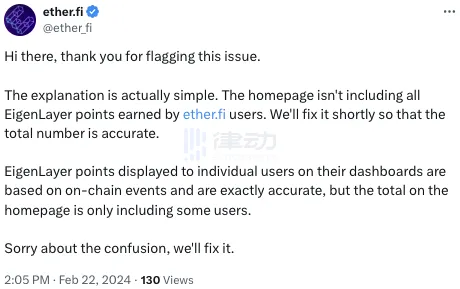在对质押机制做出解释后不久,ether.fi 团队再次向 BlockBeats表示,协议主页显示的积分确实有误,用户实际所获得的 EigenLayer 积分比当前错误显示的数据要高很多,每个用户在他们自己的仪表板上看到的积分数量是完全正确的,只是主页上的总数没有正确报告。ether.fi 团队将在明天解决这个问题。