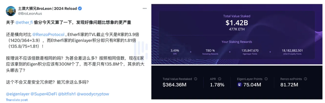 今日,有成员经过测算发现,此时 ether.fi 的 TVL 为 14.2 亿,Renzo Protocol 的 TVL 为 3.6436 亿,仅约占 ether.fi 的 1/4,ether.fi 上的积分却只有 Renzo Protocol 的 1.81 倍。如果按照 Renzo Protocol 的 TVL 与 EigenLayer 积分比值推算,ether.fi 上的积分应该是目前显示的两倍左右。这样的差距已经不能用质押机制不同来解释,但 ether.fi 在此之前并没有就此作出回应。