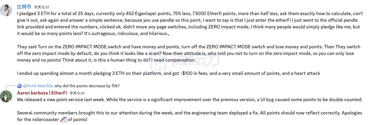 缩水一半,少算的积分去哪了?这样的发现激起了社区的讨论,不见回应,社区成员将此事上升到团队人品和做事方式上。ether.fi 的 Discord 社区里,有人对发现自己积分减少的成员回复称,「如果你只少了 10k 积分,那你还是幸运的」。在推特上,也有 ether.fi 的早期关注者表示「一点也不惊讶」。