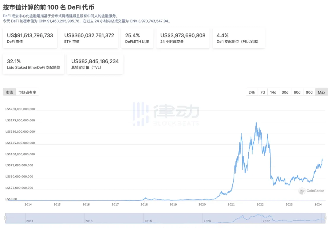 据 CoinGecko 的数据显示,目前,各个链上 DeFi 代币的市值超过 900 亿美元(91,513,796,733 美元),总锁定价值(TVL)超 800 亿美元($82,845,186,234 美元)。这里面的 DeFi 产品包括去中心化借贷、去中心化交易、去中心化衍生品和去中心化稳定币。在这些 DeFi 产品里,ETH 链上的比率占 25.4%。