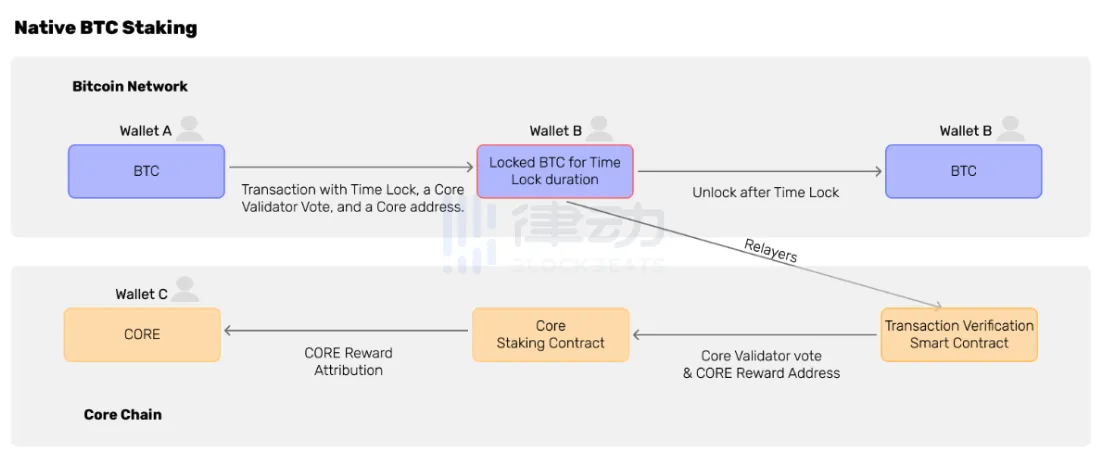 因此,与持有者将比特币委托给外部质押不同,Core 链上的质押者只需要在交易中将他们的比特币放入绝对时间锁中,交易可以被设计为在时间段过去后返回输出。