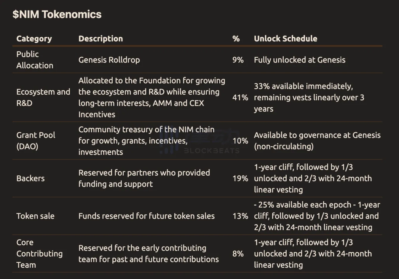 此前已经说过,由于 NIM 使用 Celestia 作为 DA 层,Dymension 作为结算层,因此 TIA、DYM 质押者将有很大概率拿到创世空投。此外,更多的代币分配细节将在未来几周内发布。