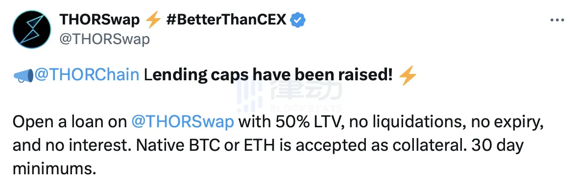 今晨,THORSwap 官方推特账号发文表示 THORChain 借贷额度已上调,LTV 最高 50%,且至少借贷 30 天,接受 BTC 和 ETH 作为抵押品。