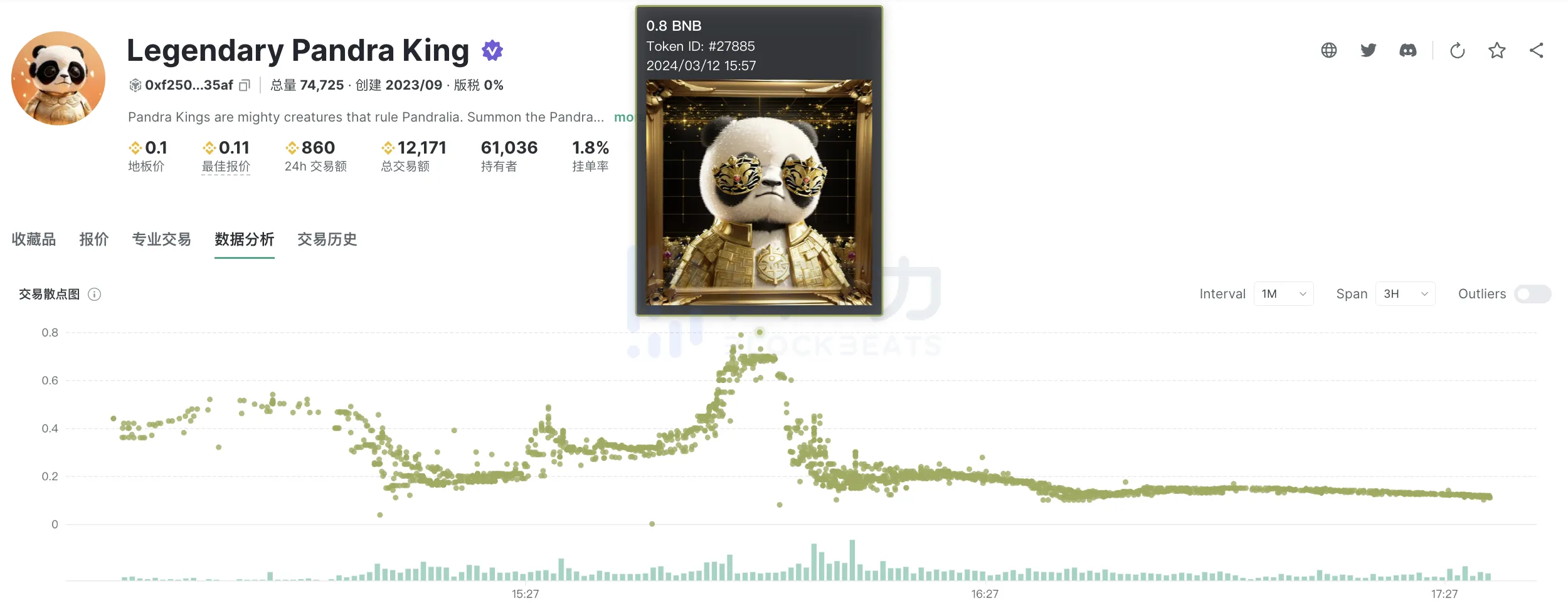 截至撰稿时,Pandra King 的地板价在 0.1BNB 附近,如果没有新的消息刺激,可能难以再回高位了。