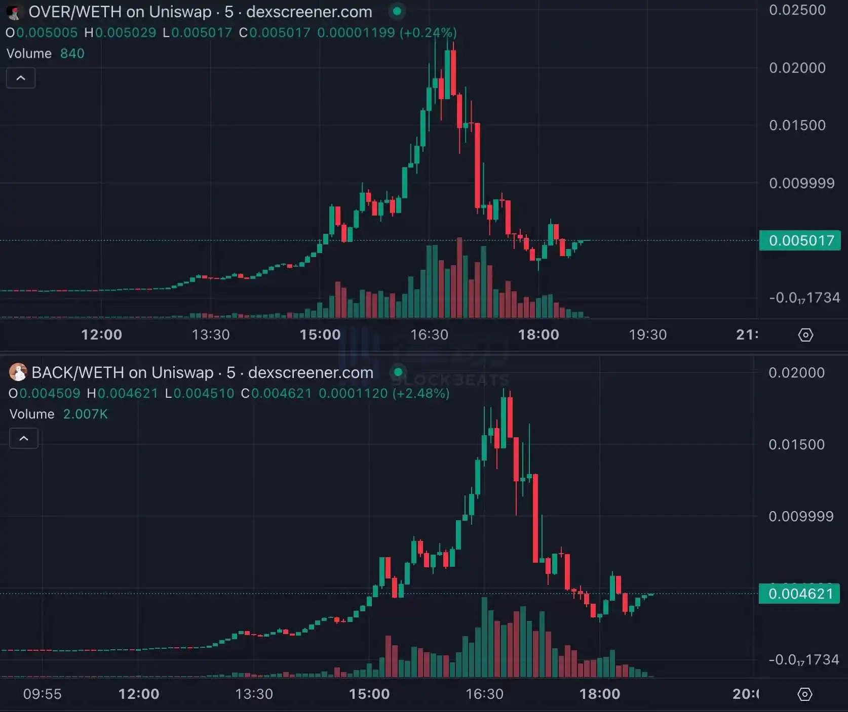 DEGEN 作为 Base 生态有一定基础面的 meme 币,下跌幅度并没有十分夸张,但包括 OVER、BACK 在内的近期开盘的 meme 币却遭遇了大幅下跌。