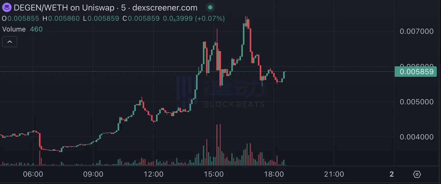 Base 头部 meme 币 DEGEN 今日从底部上涨至 0.007 美元以上,但截止撰稿时已跌至 0.005 美元。