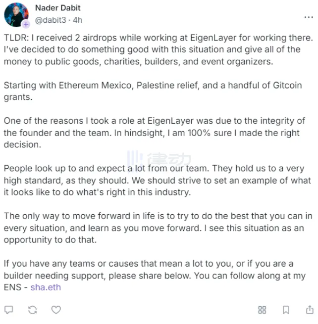 EigenLayer开发者:曾收到两次空投,资金将用于公益慈善