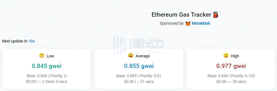 BlockBeats 消息,8 月 19 日,Etherscan 数据显示,当前以太坊网络 Gas 费下降至 1gwei 下方,暂为 0.845 gwei。