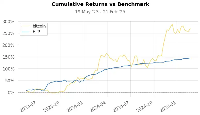 · 累计回报:143%(HLP)vs 264%(BTC)