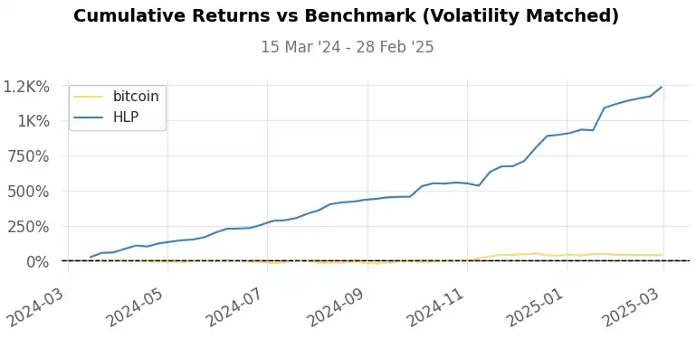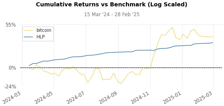 · 年度波动率:17.89%(HLP)vs 45.67%(BTC)