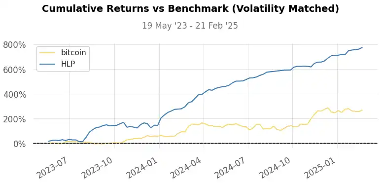· Sharpe 比率:2.89(HLP)vs 1.80(BTC)