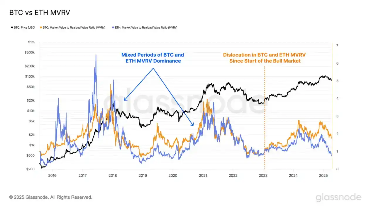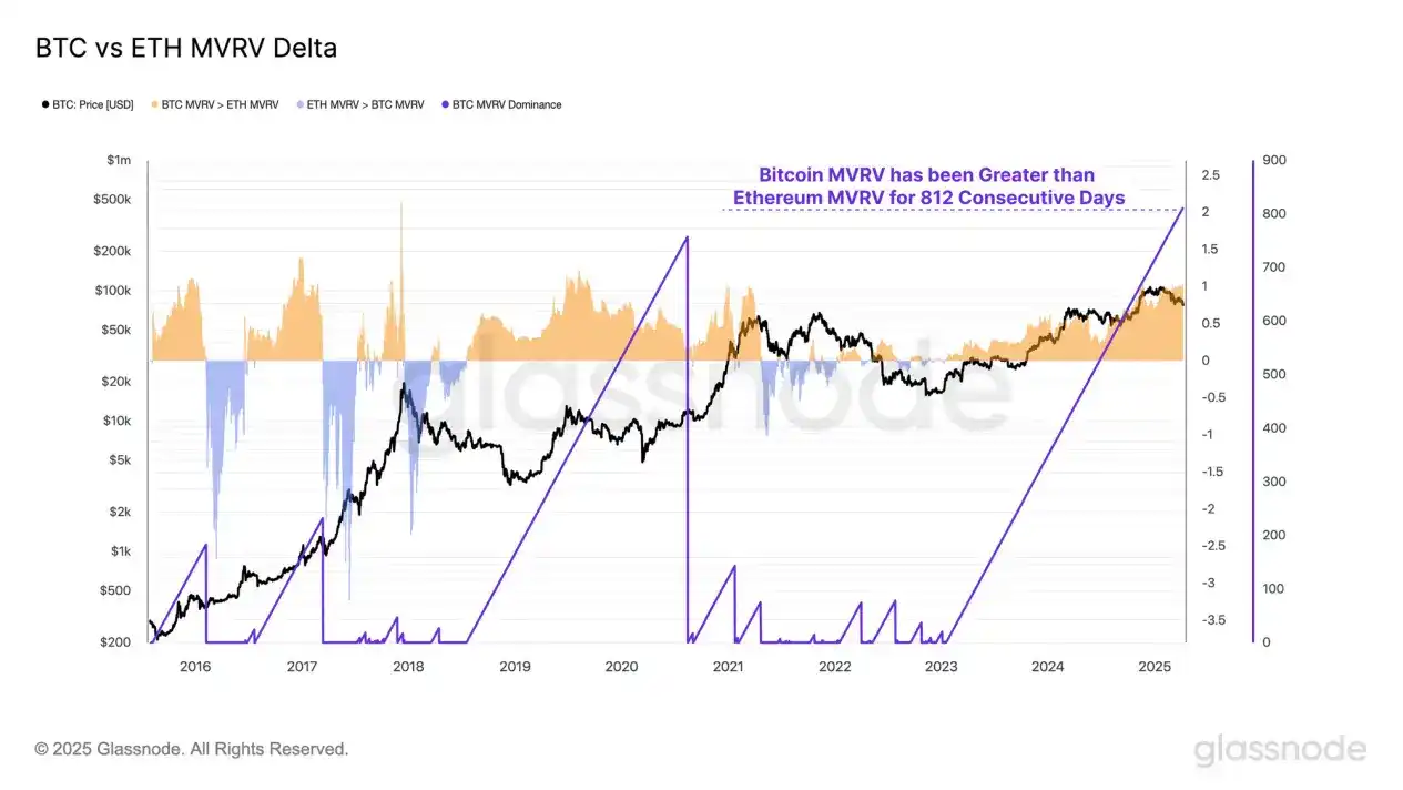 通过计算比特币与以太坊 MVRV 比率之间的差值,我们可以识别出在某些时期,平均而言,比特币持有者的账面收益是否优于或劣于以太坊持有者。