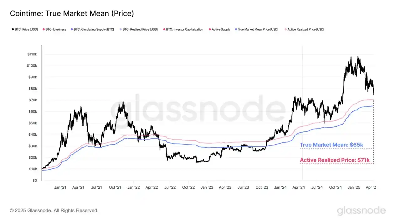 活跃已实现价格(Active Realized Price)与真实市场均值(True Market Mean)是另一组价格模型,通常位于比特币周期的中轴位置附近。这两个模型通过剔除遗失或长期未动用的供应,来估算市场中活跃参与者的成本基础。