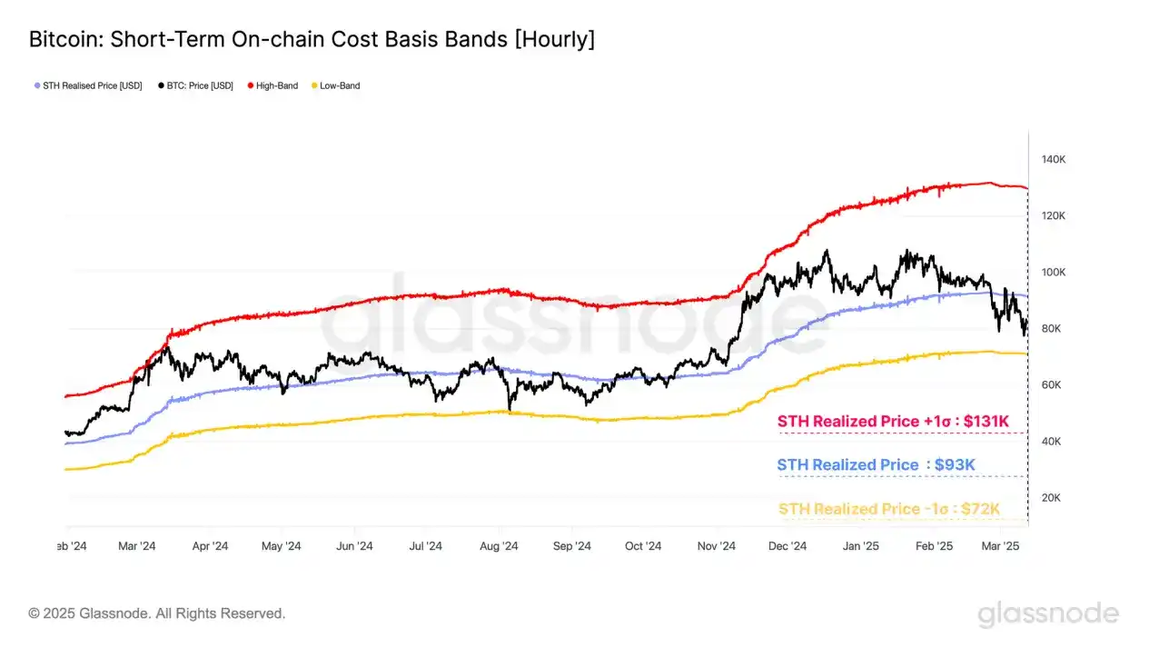 短期持有者(STH)成本基准历来被视为判断牛市期间市场动能的关键参考水平。围绕该成本基准构建±1 个标准差区间,通常可作为局部价格波动的上沿与下沿。
