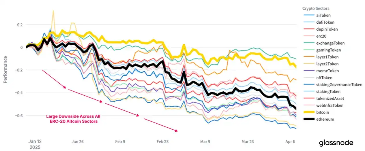 特朗普政府宣布「解放日」关税政策,导致金融市场剧烈震荡,主要宏观指数普遍下跌,数字资产市场亦未能幸免,出现全面下滑。