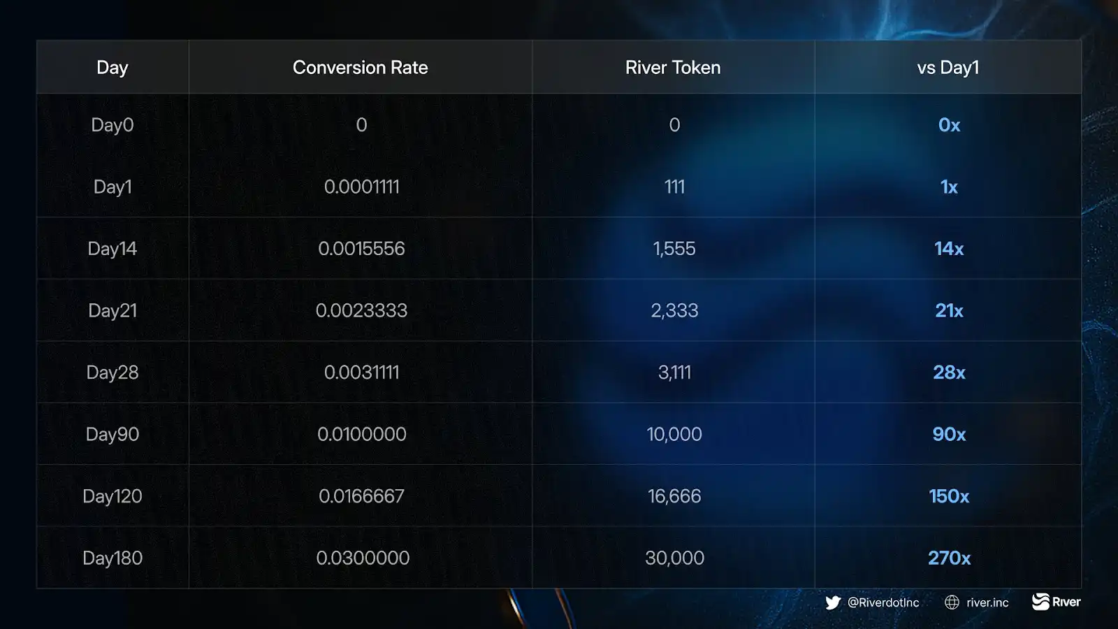 真正的关键在于:比例并非固定,而是随时间不断提升。你等待的时间越久,手中的 River Pts 能兑换到的 RIVER 代币就越多。假设你目前持有 1M(百万)River Pts,根据在第 1 天、90 天、180 天兑换,会对应不同数量的 RIVER 代币。