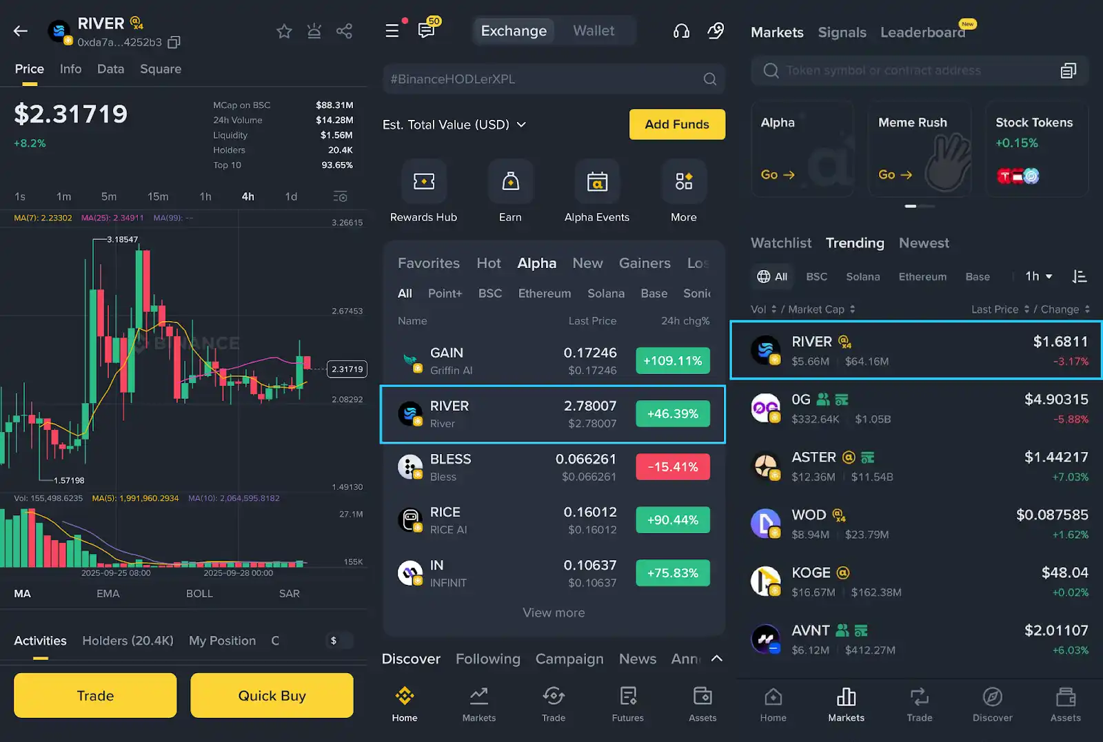 9 月 25 日,$RIVER 在 Binance Alpha 上线后迅速拉升,最高触及 3.1 美元,相较 IDO 价格上涨 6200%,还上线了 Bitget 等多家国际交易平台。