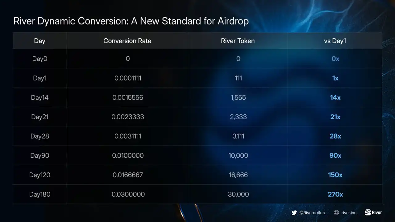 除了作为 Binance Wallet 新机制的首发项目,River 在 TGE 时更引发市场讨论的,是 Dynamic Airdrop Conversion(动态空投转换机制)。该机制允许用户在 180 天内自由选择兑换时点,越晚转换,获得的代币越多。换言之,用户必须在「立即退出」与「长期持有」之间做出抉择。