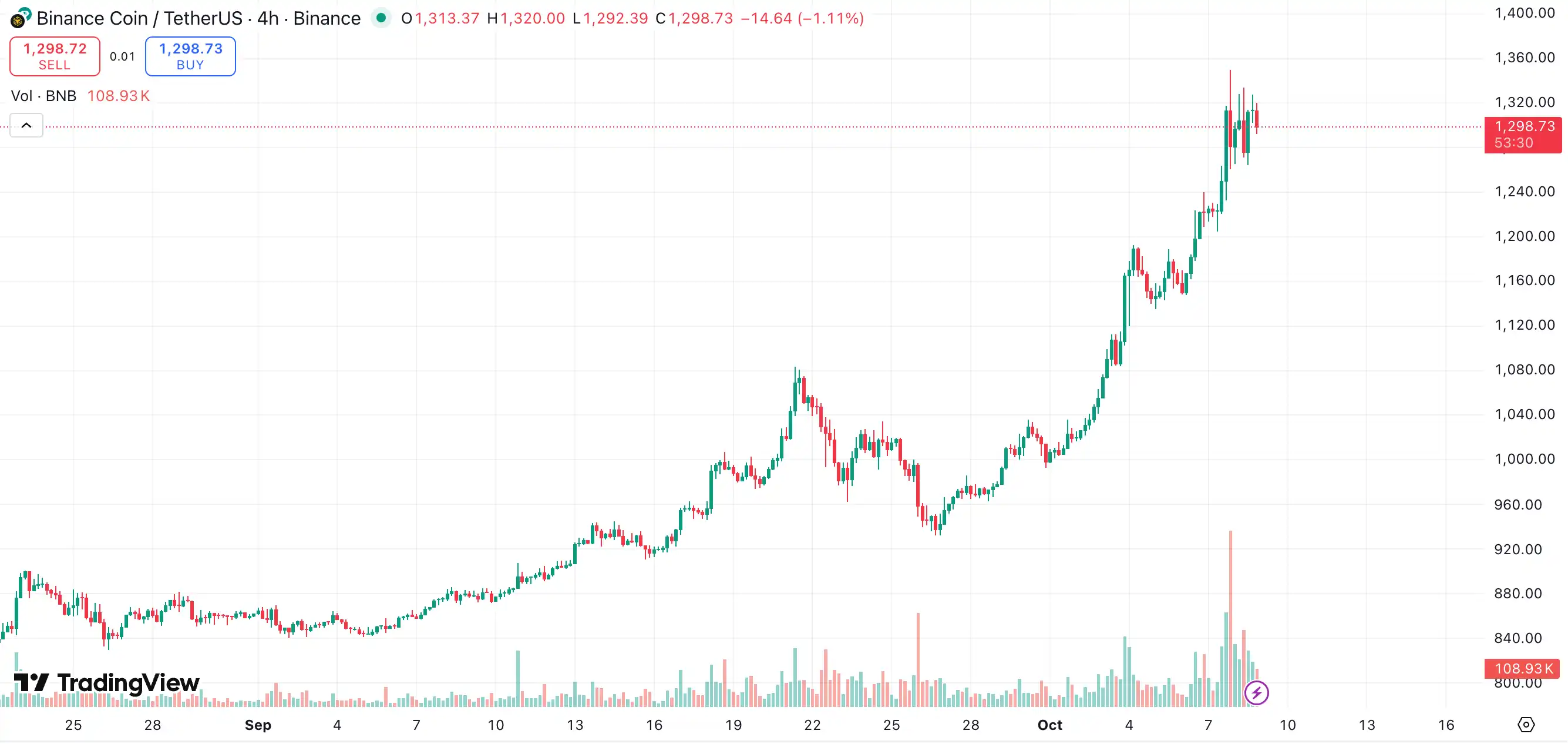 尽管比特币在国庆期间突破历史新高,但整个加密生态的注意力显然放在了 BSC 生态。10 月 7 日,BNB 突破 1300 美元,创历史新高。据 8market 数据显示,BNB 市值达 1777.8 亿美元,超越 Tether(1775 亿美元),世界主流资产市值排行升至第 124 位。