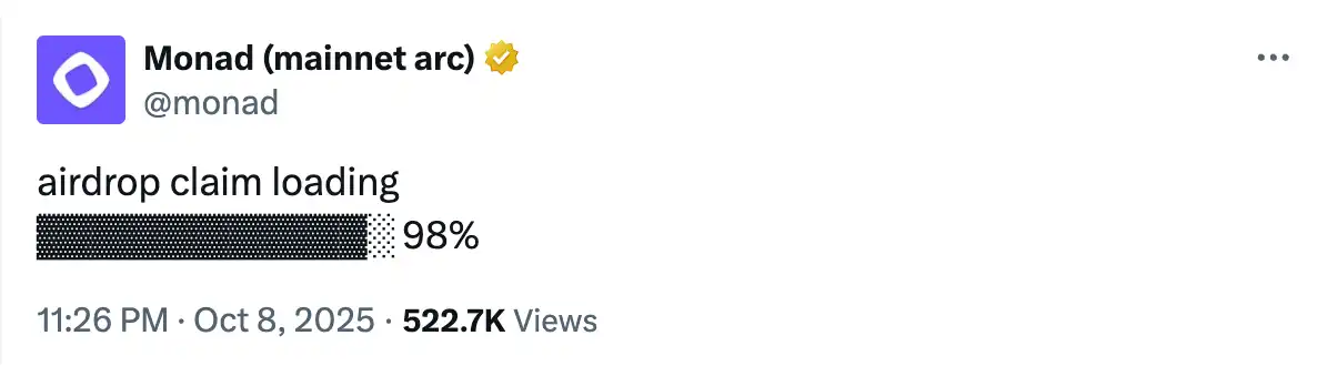 10 月 8 日,Monad 在其官方 X 账号发布空投预告推文:「空投领取加载中(98% 已完成)」。8 月中旬,Monad 发文暗示或将于今年上线主网。