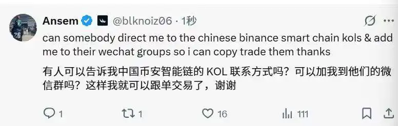 「币安人生」巨大的财富效应使海外 Meme 社区垂涎若滴,纷纷想要融入中文社区,海外知名 KOL Ansem 也发帖求加入 BSC 中文社区。