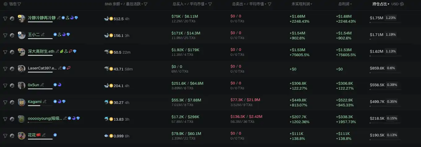 根据 GMGN 数据,冷静共买入 7.5 万美元,持仓 1.23%,目前浮盈超 165 万美元,未有卖出;王小二共买入 17.1 万美元,持仓 1.19%,目前浮盈超 154 万美元,未有卖出;深大高材生共买入 1920 美元,持仓 1.13%,目前浮盈超 153 万美元,未有卖出;0 xSun 共买入 25.16 万美元,持仓 0.39%,目前浮盈超 30 万美元,未有卖出。