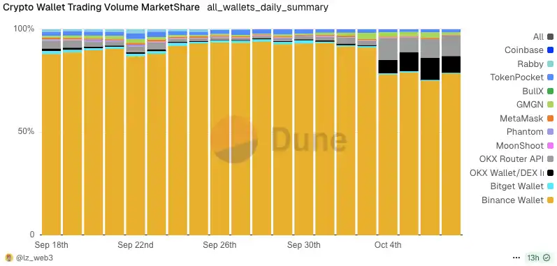 Binance钱包于去年末推出,刚刚上线时饱受争议,而自Binance Alpha 上线后,如今Binance钱包无论是交易量、用户活跃度都已经稳居加密钱包第一的位置,根据 Dune 数据,Binance钱包已占据了加密钱包市场 90% 的份额。