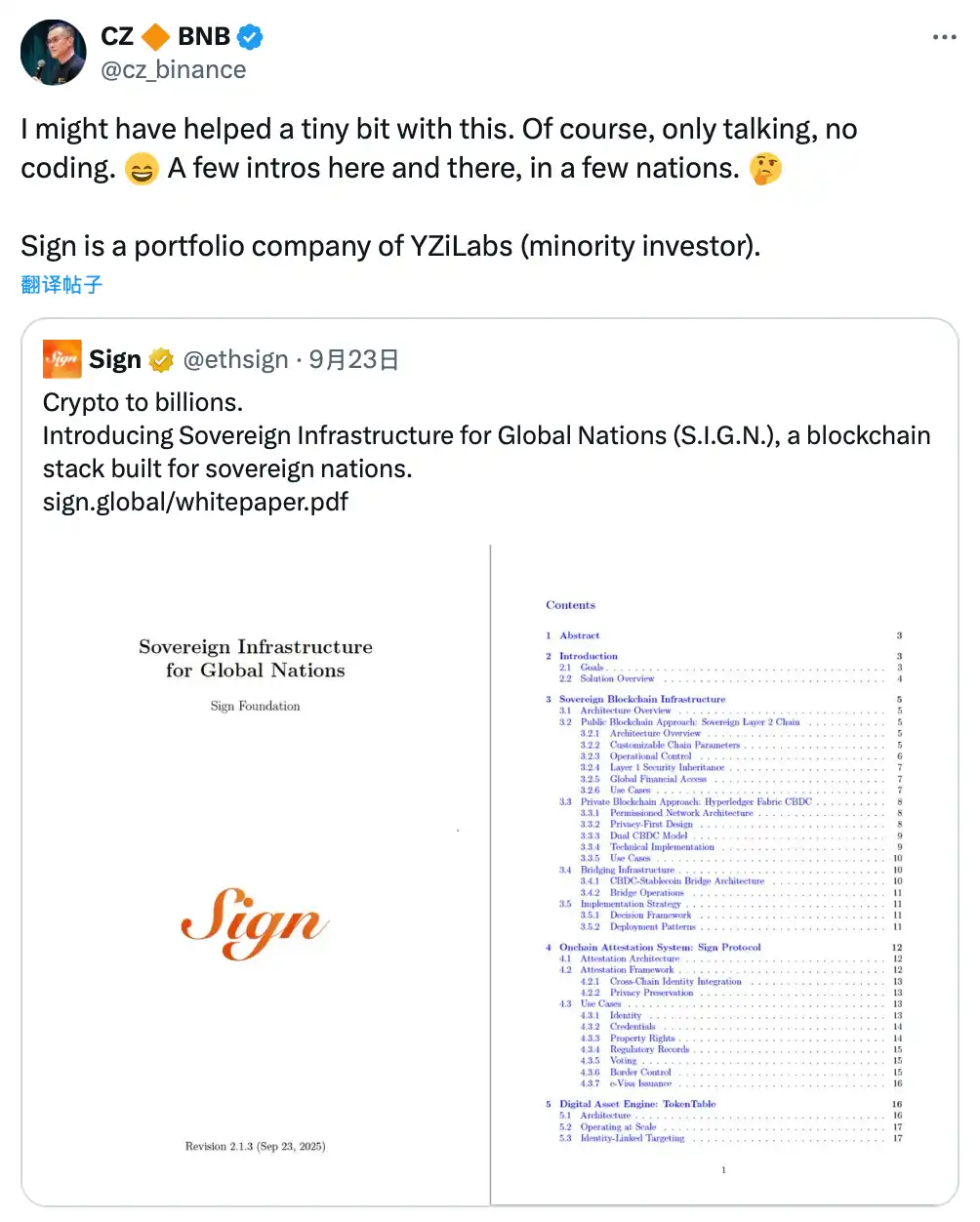 在加密世界,项目发布白皮书往往被视为快速立项,抢占市场。然而,Sign 发布白皮书的意义远不止于此。这并非一时之快,而是长期战略布局,是一条经过深度铺垫、不断实践和积累才走通的道路。S.I.G.N. 的出现,并不是凭空而来。它背后有着来自行业核心人物与机构的长期支持。Binance 创始人 CZ 曾公开表示,自己不仅在投资和理念上关注 Sign,还在多个国家间帮助 Sign 牵线搭桥。