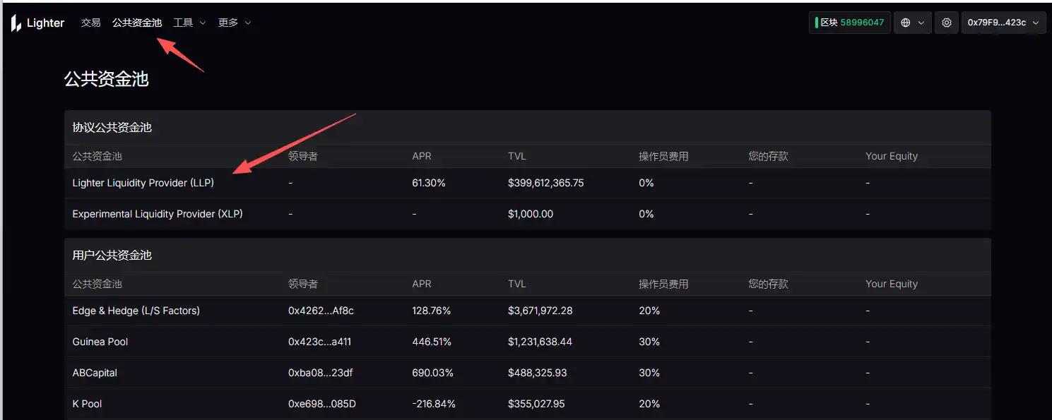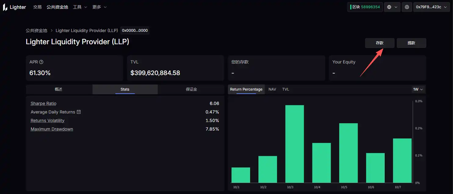 STEP 2. 点击「公共资金池」后选择 LLP,存入资金,即可开始交易赚积分。