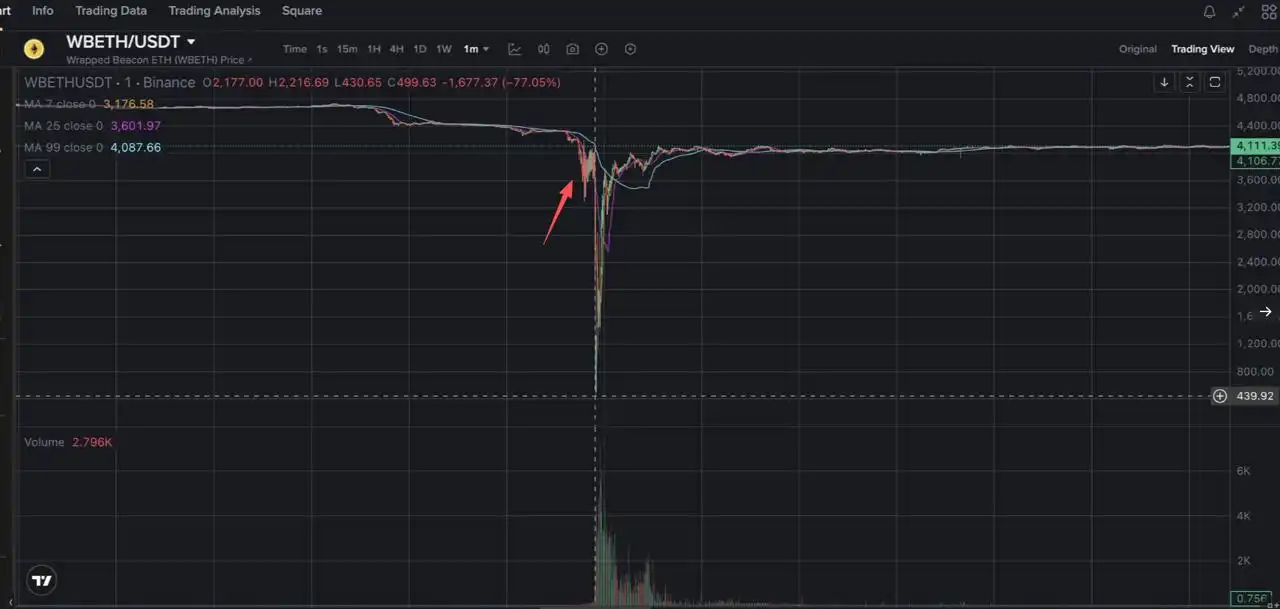 由于 Binance 统一保证金系统允许跨资产抵押,这导致 wBETH 和 BNSOL 仓位被强制平仓。而强制平仓的操纵在 wBETH 和 BNSOL 现货流动性很差(wBETH 日均交易深度仅约 2,000 ETH)的情况下导致二者的现货价格短时脱锚 20%+,而 Binance 这个时候抵押价值的预言机还拿的是现货价格,导致抵押物极度缩水,引发市场猛烈爆仓。