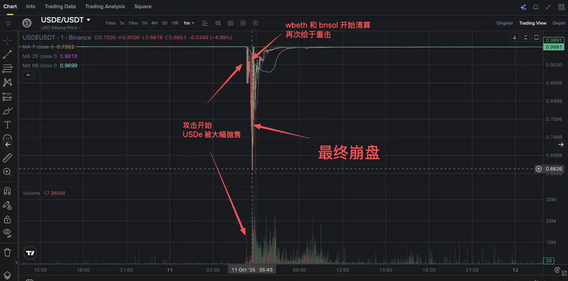 最终达到脱锚顶峰:USDe 0.65 wBETH 跌至$430,BNSOL 跌至$34.90