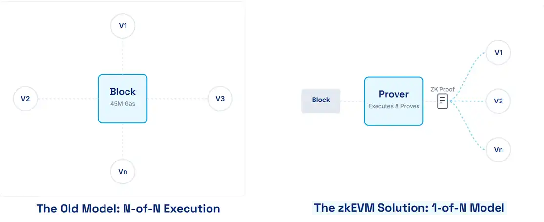 · 1 of N 新范式:由少数 prover 执行整块并产出短证明;全网只做常数时间验证。验证成本远低于重执行,可安全提高 L1 gas 上限,并减少硬件要求。