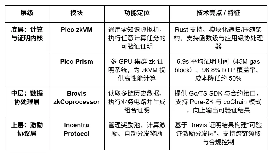 Brevis 以「通用 zkVM(Pico/Prism)」与「数据协处理器(zkCoprocessor)」构建多链可信计算层:前者解决任意计算可验证问题,后者实现历史与跨链数据的业务落地。