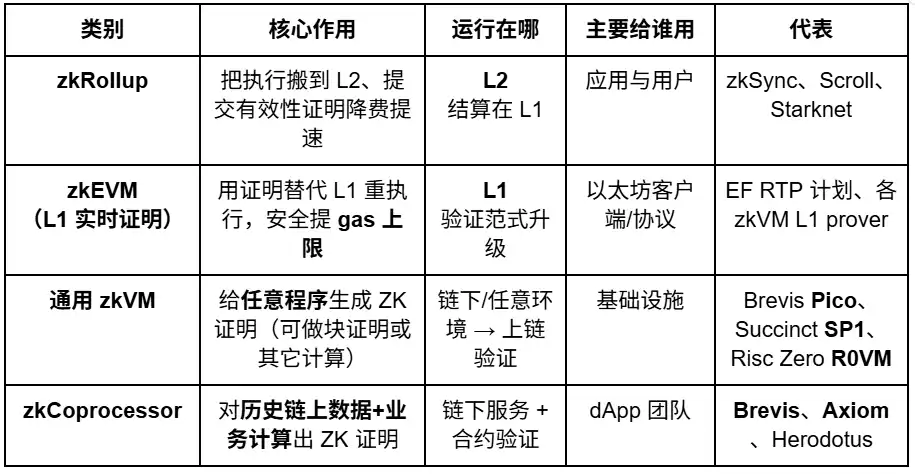 而在以太坊生态之外,零知识证明(ZKP)技术也延伸至更广泛的通用可验证计算(Verifiable Computing)领域,形成以 zkVM 与 zkCoprocessor 为核心的两类技术体系。