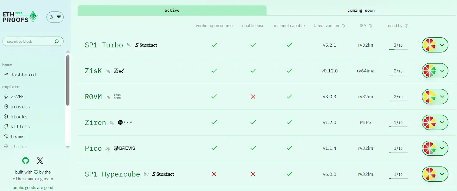 目前,以太坊基金会支持的 ETHProofs.org 已成为 L1 zkEVM 实时证明(Realtime Proving, RTP)路线的核心追踪平台,用于公开展示各 zkVM 的性能、安全与主网适配进展。