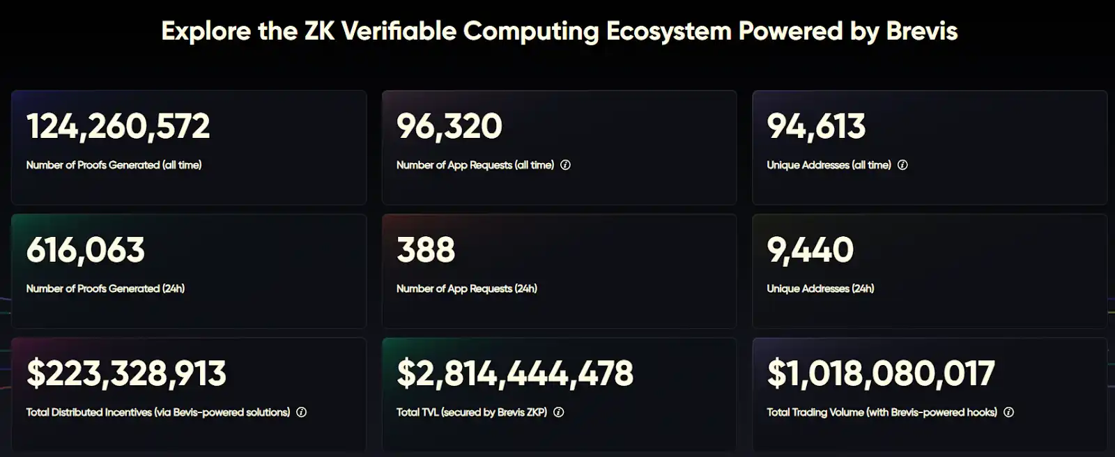 根据 Brevis Explorer 数据,截至 2025 年 10 月,Brevis 网络 已累计生成超 1.25 亿条 ZK 证明,覆盖近 9.5 万个地址、9.6 万次应用请求,广泛服务于奖励分发、交易验证与质押证明等场景。生态层面,平台累计分发激励约 2.23 亿美元,支撑的 TVL 超 28 亿美元,相关交易量累计突破 10 亿美元。
