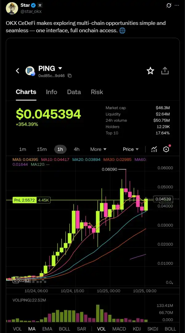 meme 币的驱动依靠市场情绪。而在 OKX CEO Star 带有 $PING 截图的推文出现后,短期内缺少了更能够驱动市场情绪的推文,$PING 的回调也在情理之中。