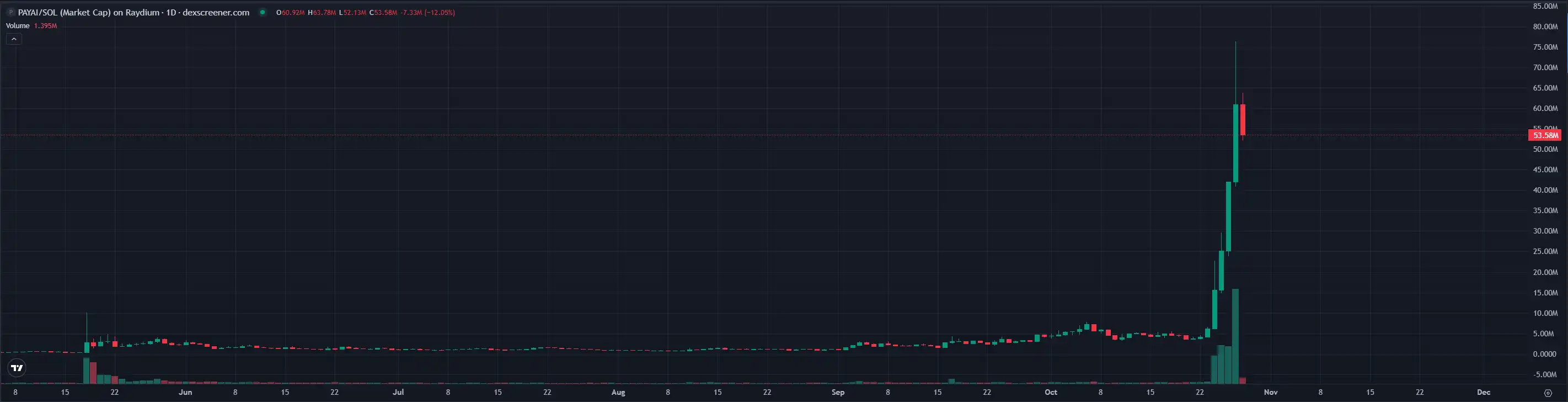 $PAYAI 后发制人,成为了 x402 协议的新龙头。昨天,$PAYAI 市值一度突破 7600 万美元,自 10 月 24 日以来最高上涨了约 12 倍。目前,该币出现回落,市值约为 5300 万美元。