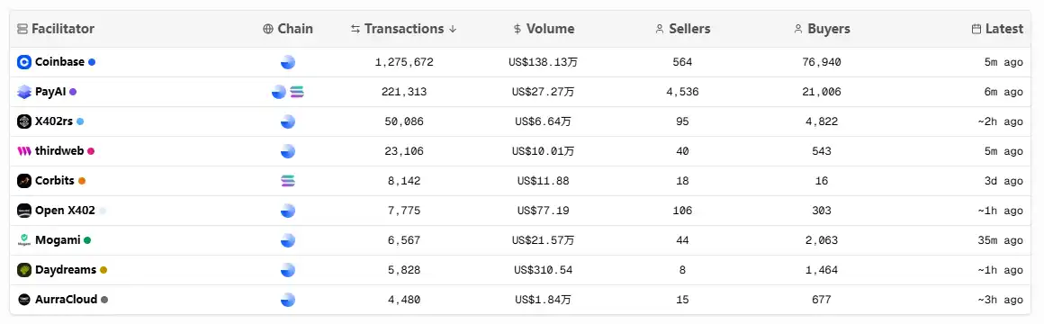 这主要得益于两方面,最主要的原因是 Payai 目前是除 Coinbase 官方外,生态第二大的 Facilitator(x402 协议链上验证与结算服务提供商):