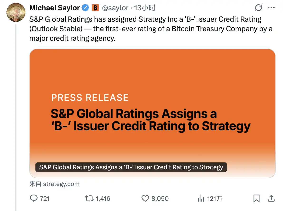 Strategy 创始人 Michael Saylor 在个人 X 账户上大大方方地转发了相关动态,并庆祝「Strategy 成为了首家获主流信用评级机构定级的数字资产财库公司」。
